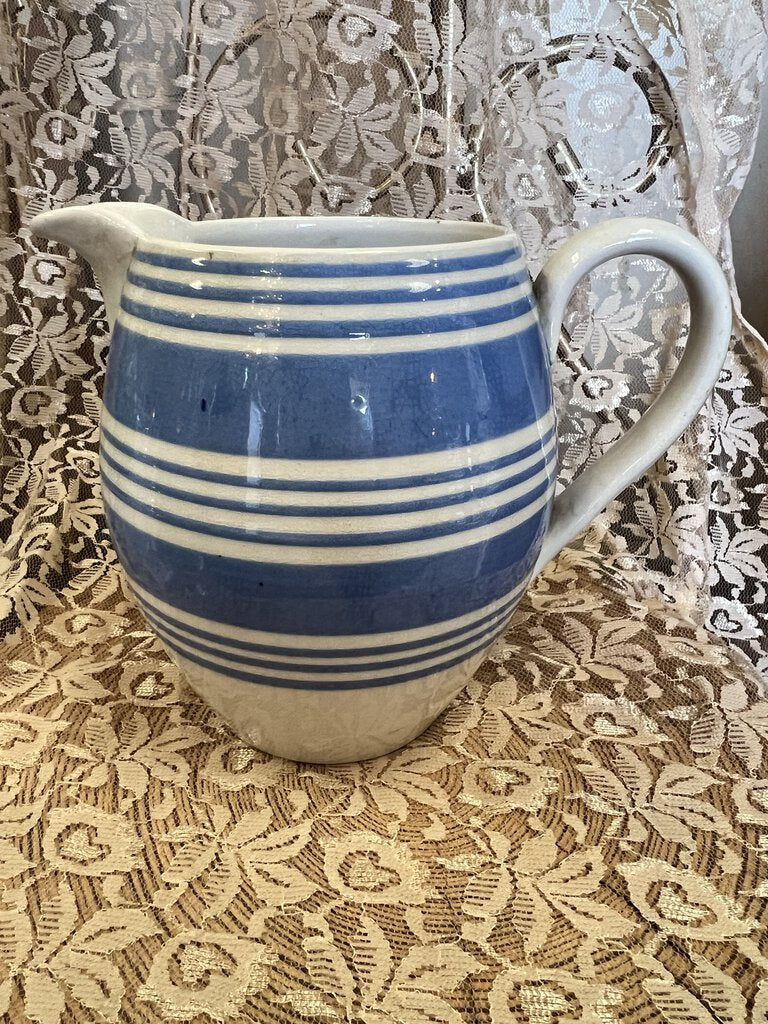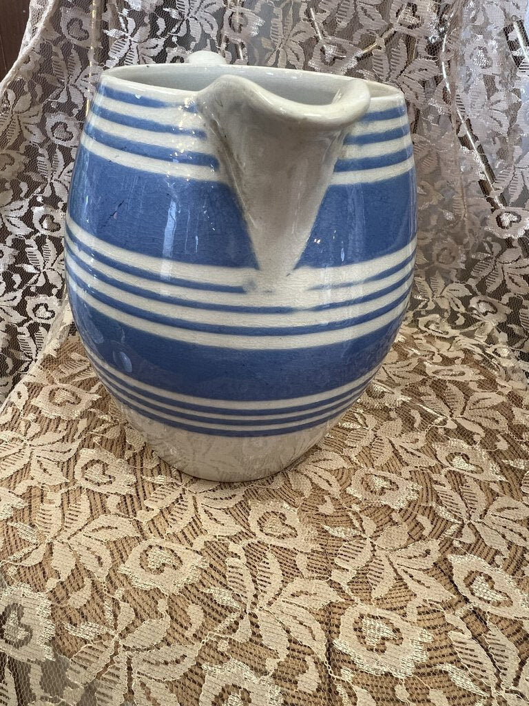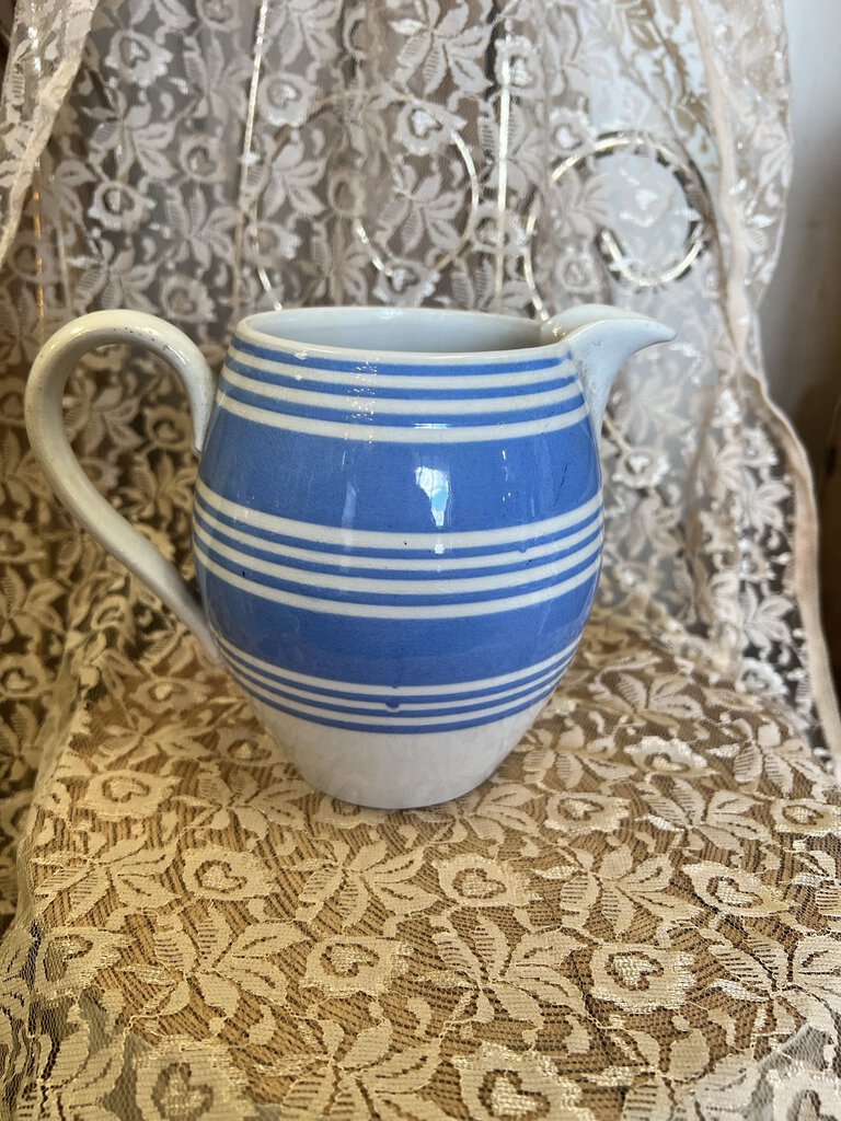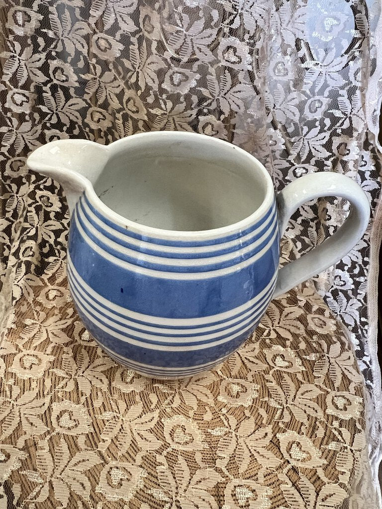 RARE AND UNIQUE FIND, MOCHAWARE WAS PRODUCED IN THE 1800'S IN THE STAFFORDSHIRE REGION OF ENGLAND. IT IS KNOWN FOR ITS DISTINCT STRIPES AND BANDS OF COLOR. THE BEAUTIFUL SLIP DECORATION ADDS TO IT UNIQUE BEAUTY. FINDING ONE IN THIS GREAT CONDITION IS A RARE FIND! THIS PARTICULAR PICE WAS DATED LATE 1800'S IN 1989. 5"ACROSS THE TOP FROM SPOUT TIP TO HANDLE; 5 1/2" HIGH
