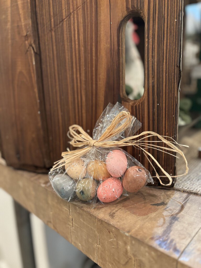 Bag of 7 speckeled spring colored eggs and measure 1.5 inches in diameter