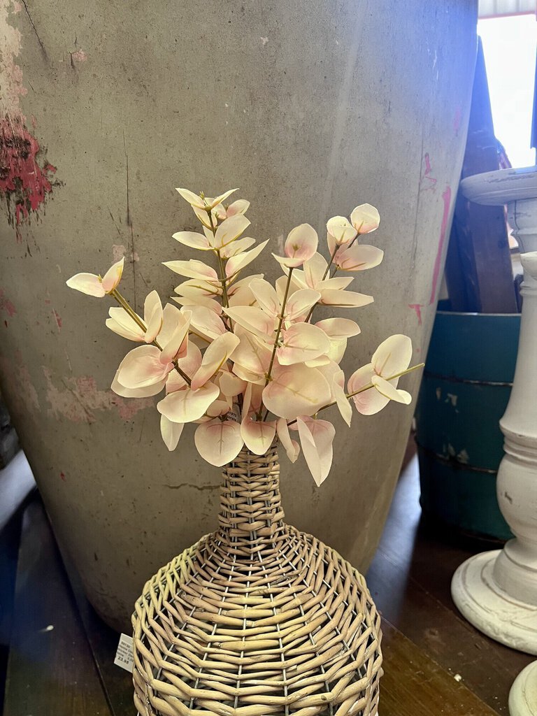 Blushing Eucalptus bundle is a bright floral made of artificial eucalyptus leaves and stems. Bundle includes four stems that have been tied together with raffia and it fits easily into vases, cans and pitchers