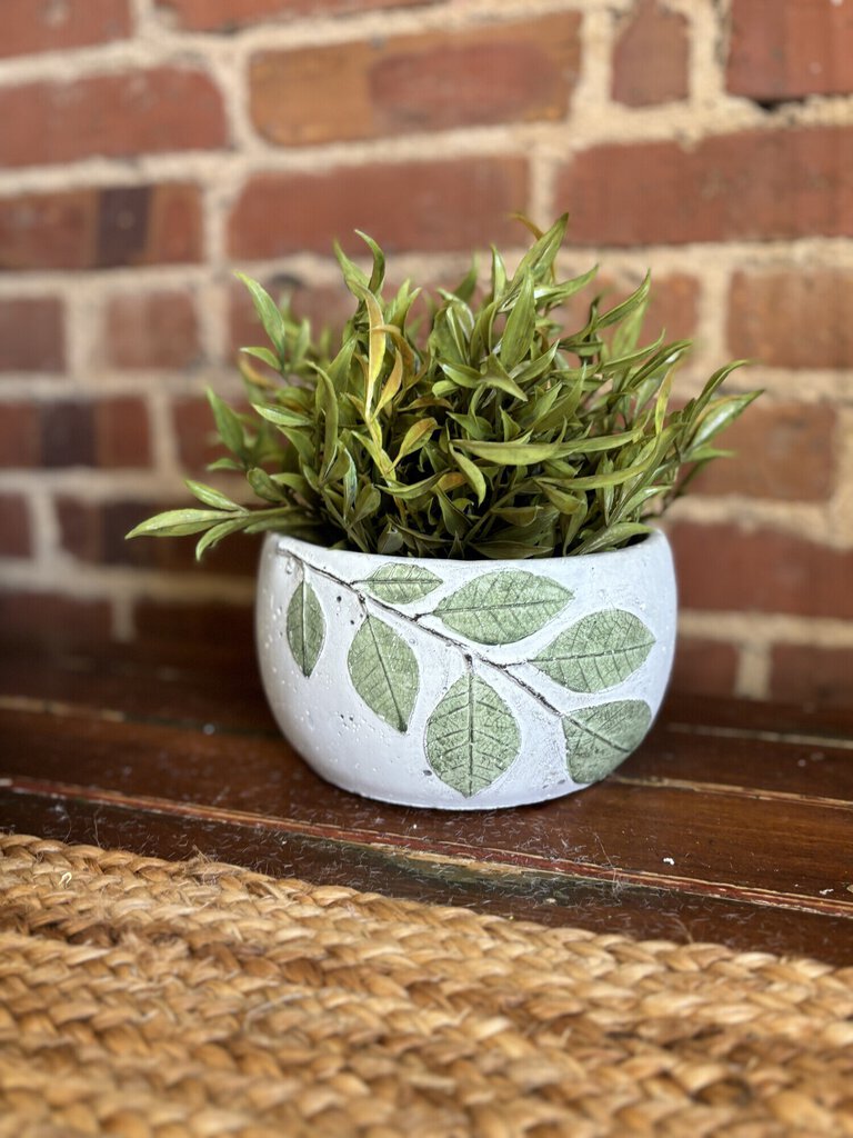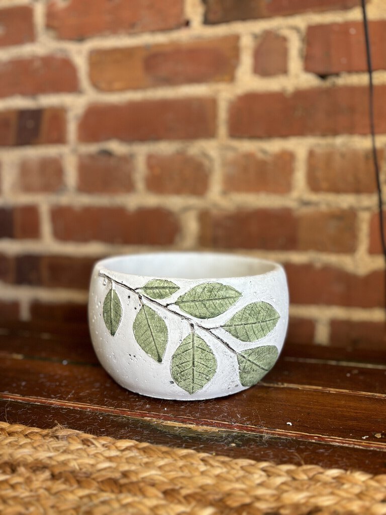 The cement planter with leaves is a pretty pot with raised painted leaves