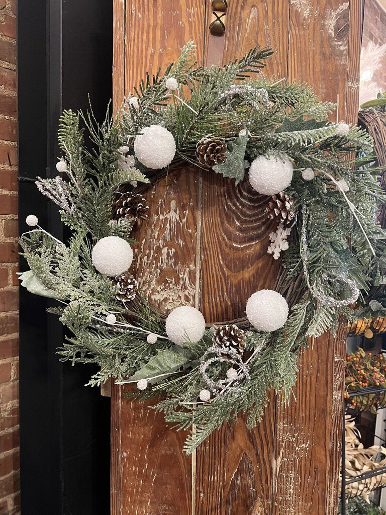 The White Christmas Wreath is the perfect wreath for a warm and inviting wintertime display. Freaturing artificial florals set on a natural grapevine base this wreath has been coated in glistening glitter for a snowy appearance. It is accented by pinecones, styrofoam balls and wooden snowflakes and will look charming in an entryway or front door. Measures 24 inches in diameter