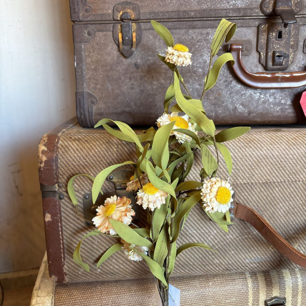 The Country Carnation Spray has ivory flowers with yellow centers and olive green leaves. The fabric flowers and foam leaves give this floral a dried look and it measures 22 inches tall