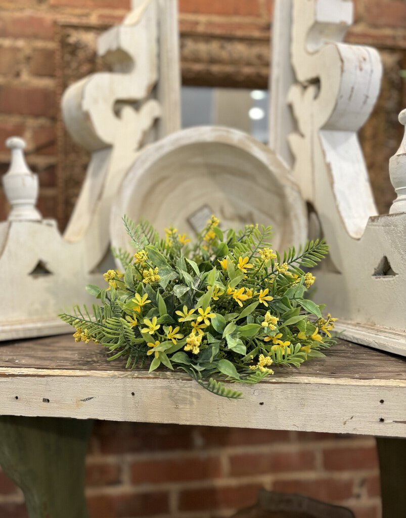 Our newest addition of half spheres is the gorgeous Yellow Fernshot. A perfect half sphere for your spring or summer decor. This beauty measures 12 inches around and has a mixture of yellow flowers and ferns