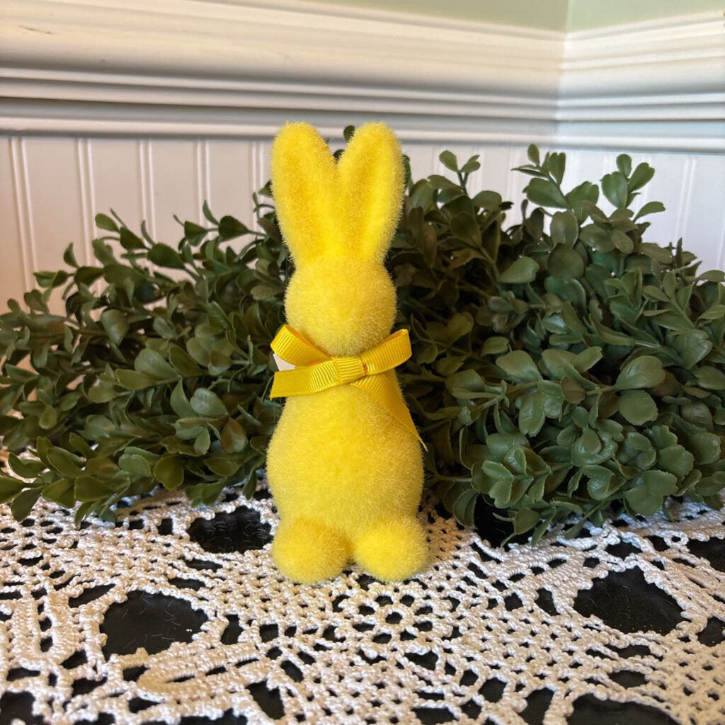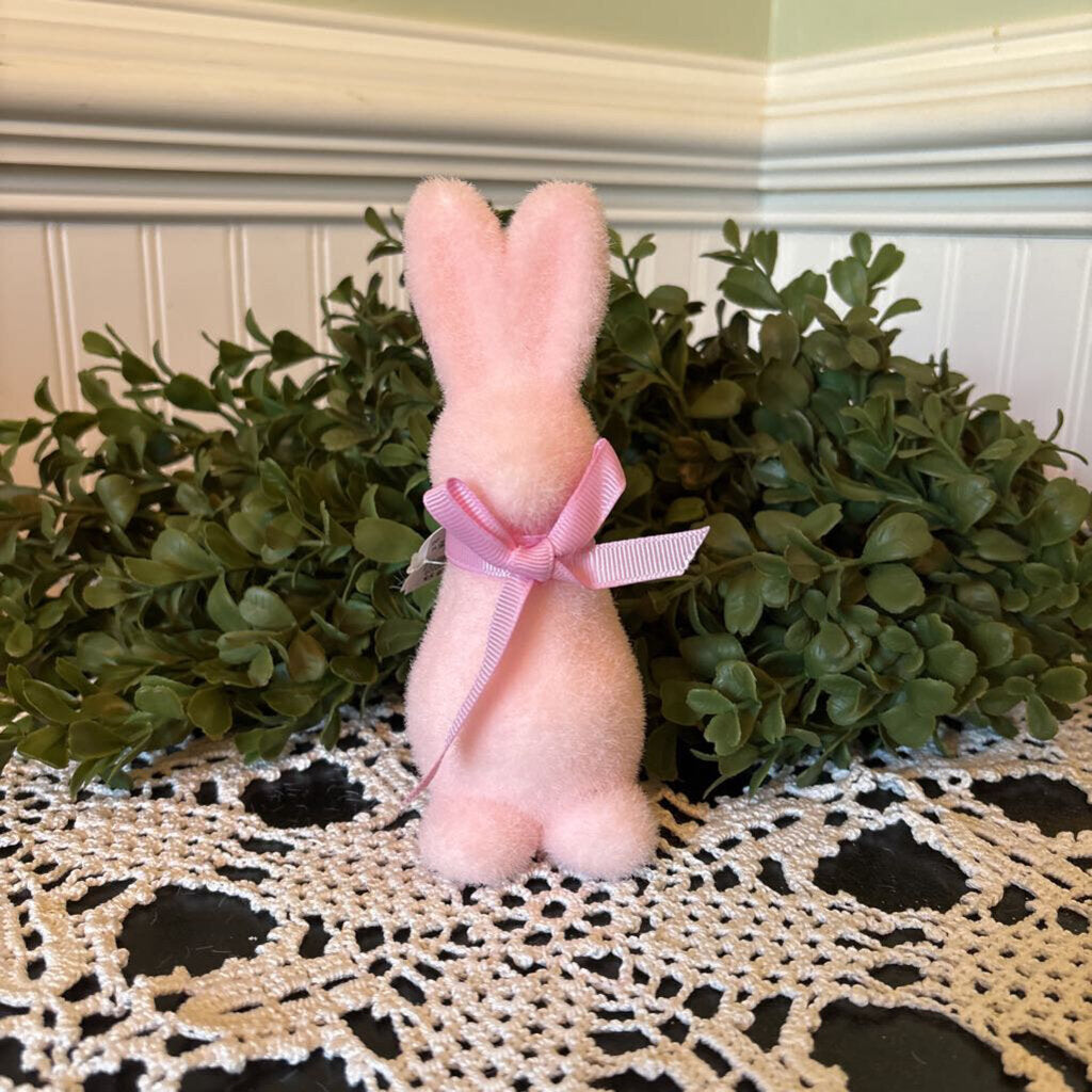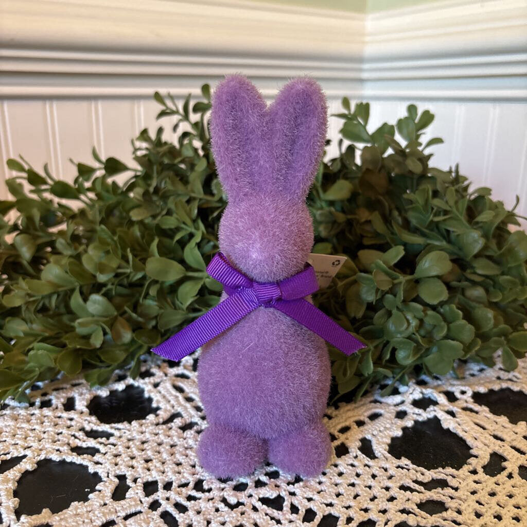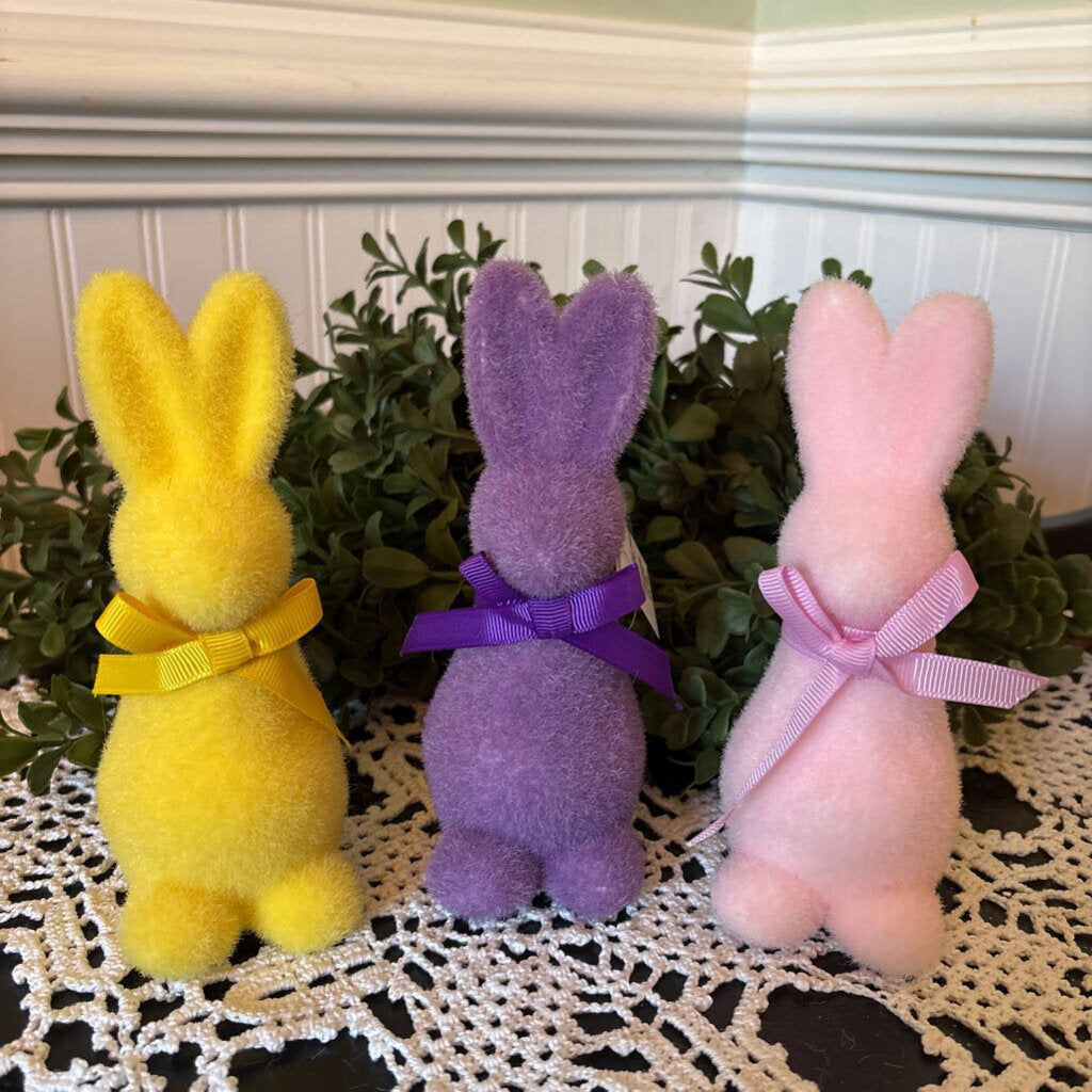 THESE BUNNIES ARE A COLORFUL ACCENT FOR SPRING OR EASTER. MADE WITH A FUZZY FLOCKED FINISH AND A MARSHMELLOW BUNNY-INSPIRED SHAPE. EASH MEASURES 6.25" T X 3" DEEP