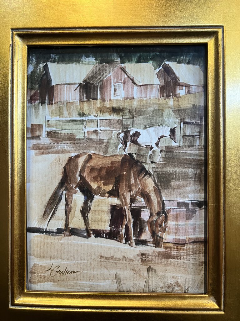 "GRAZING PONIES" IS AN ORIGINAL ACRYLIC PAINTING BY COLORADO ARTIST L.B.GRAHAM. THIS ONE OF A KIND PIECE IS GALLERY FRAMED AND READY TO HANG IN YOUR COLLECTION! 11" X 12 1/2"
