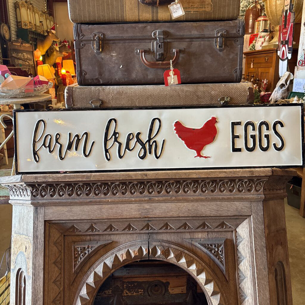 CUTE METAL SIGN THAT WOULD BE CUTE HANGING ON YOUR CHICKEN COOP. 35" X 8"