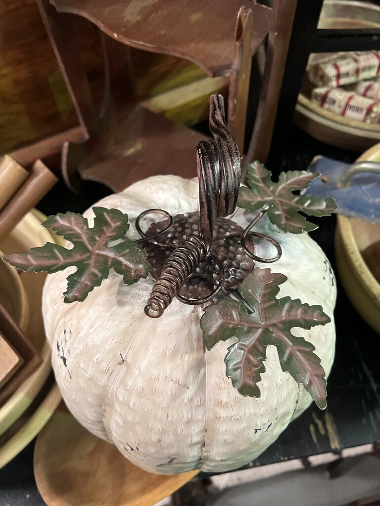 This beautiful distressed white pumpkin that stands 12 inches tall and is 9 inches wide would be a perfect addition to your fall decor and because its metal it can be used outdoors as well!