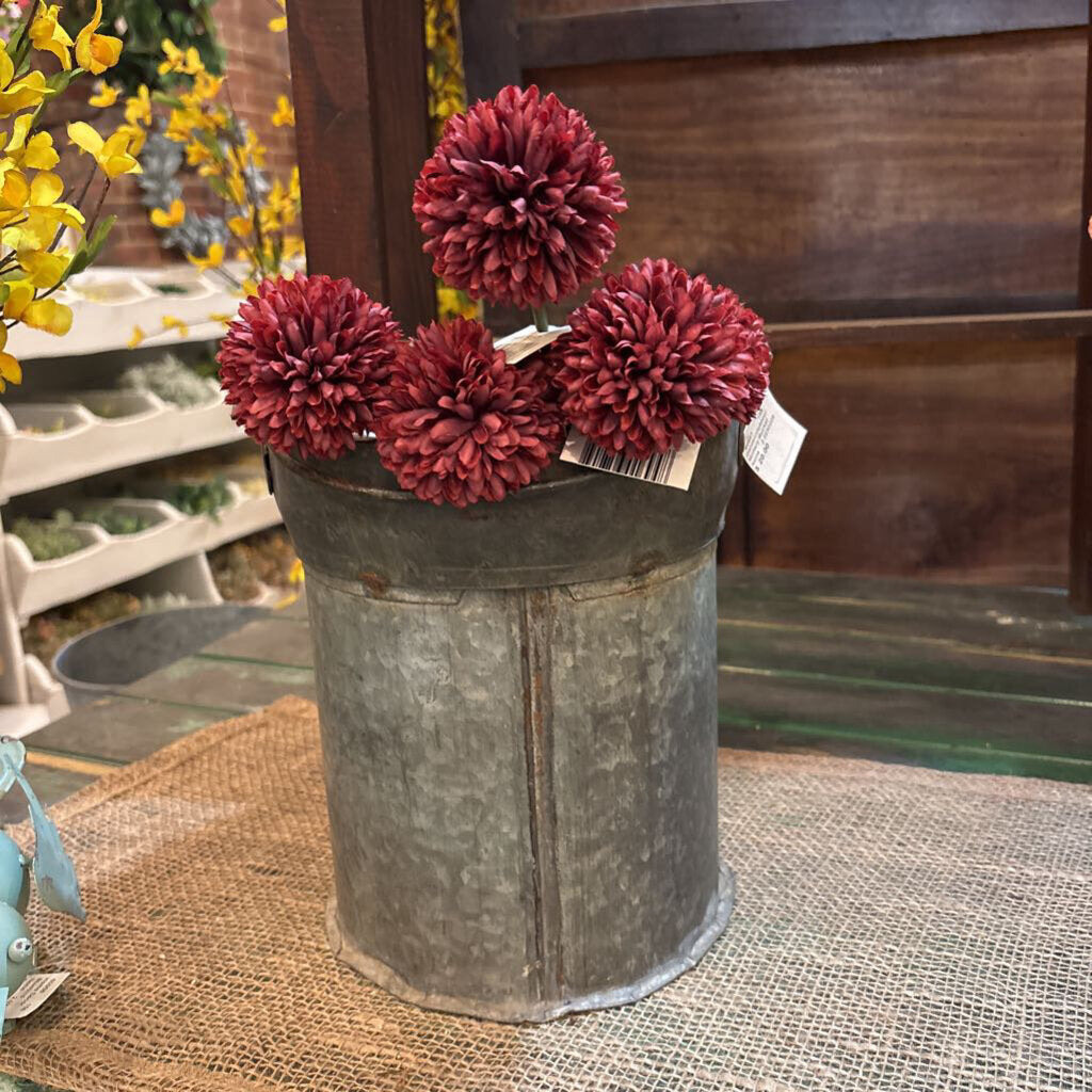 METAL BUCKET WITH A MILITARY STYLE, GREAT FOR A PATRIOTIC FLOWER ARRANGEMENT. MEASURES 9" TALL X 7" WIDE