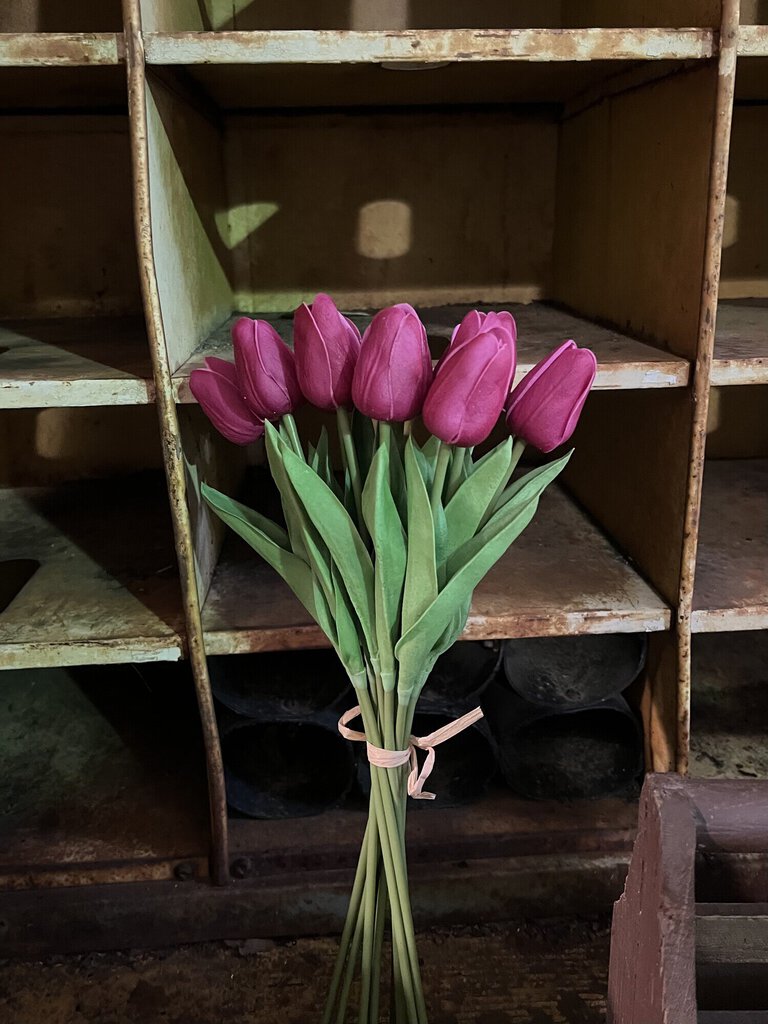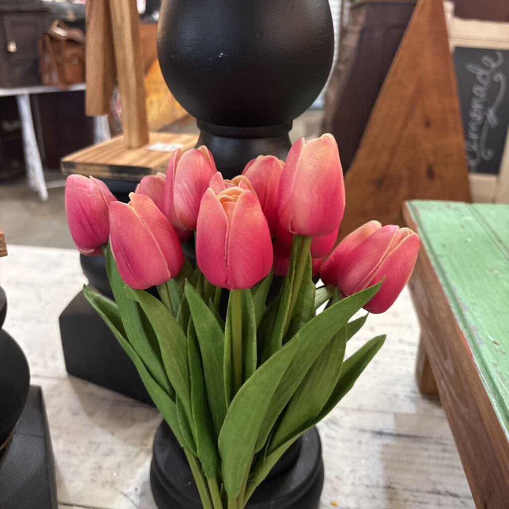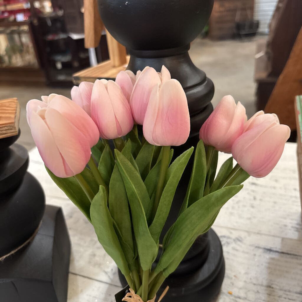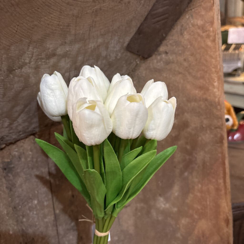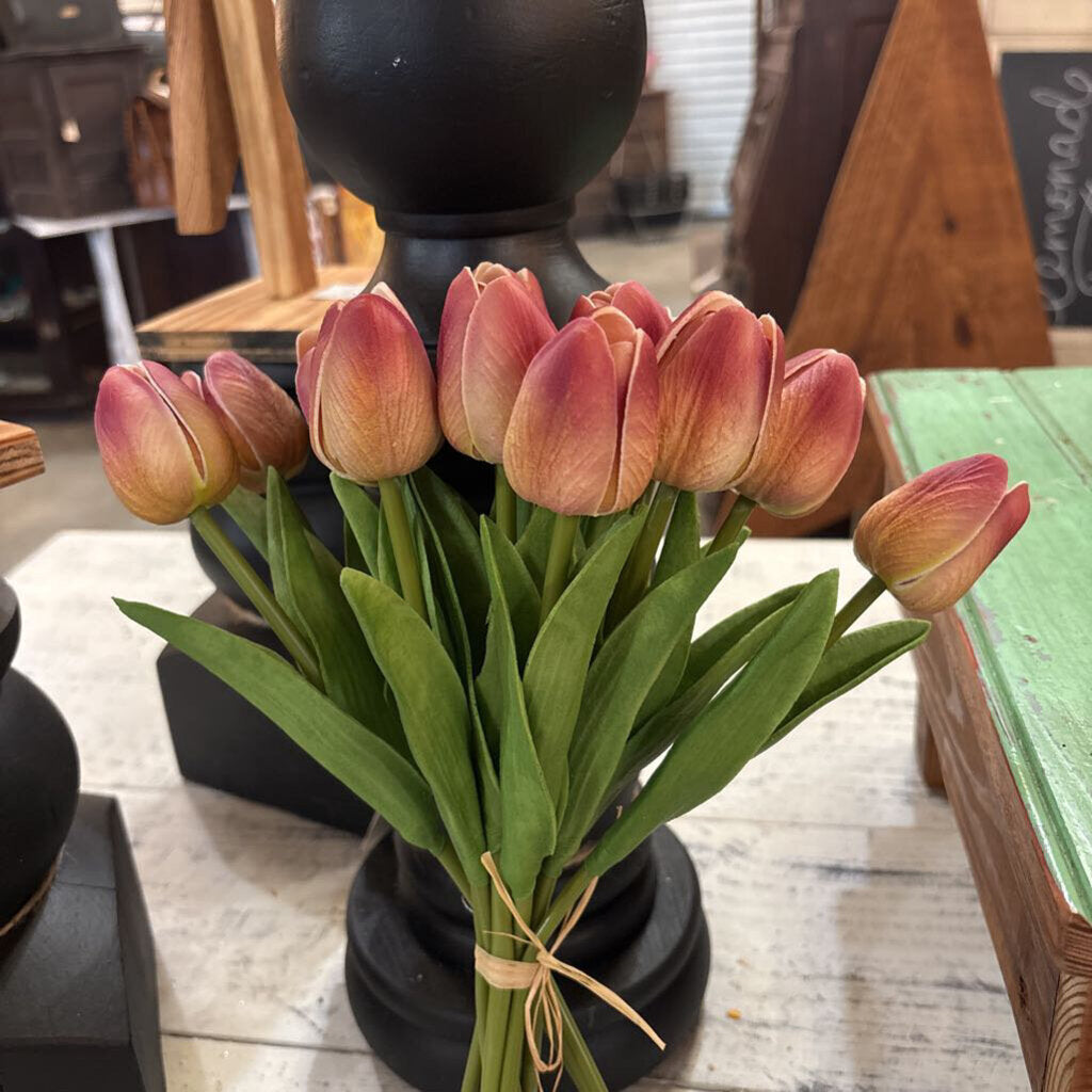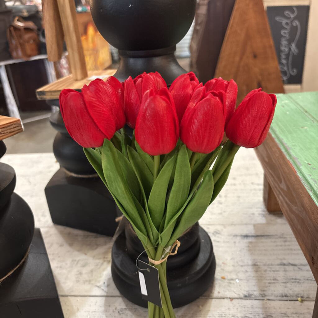 THESE BEAUTIFUL TULIPS LOOK AND FEEL SO REAL WITHOUT THE WORRY OF THEM GOING BAD. THEY COME IN A BUNDLE OF 12 TIED WITH A RAFFIA BOW AND CAN EASILY BE SEPERATED. THYE MEASURE APPROX 13" TALL