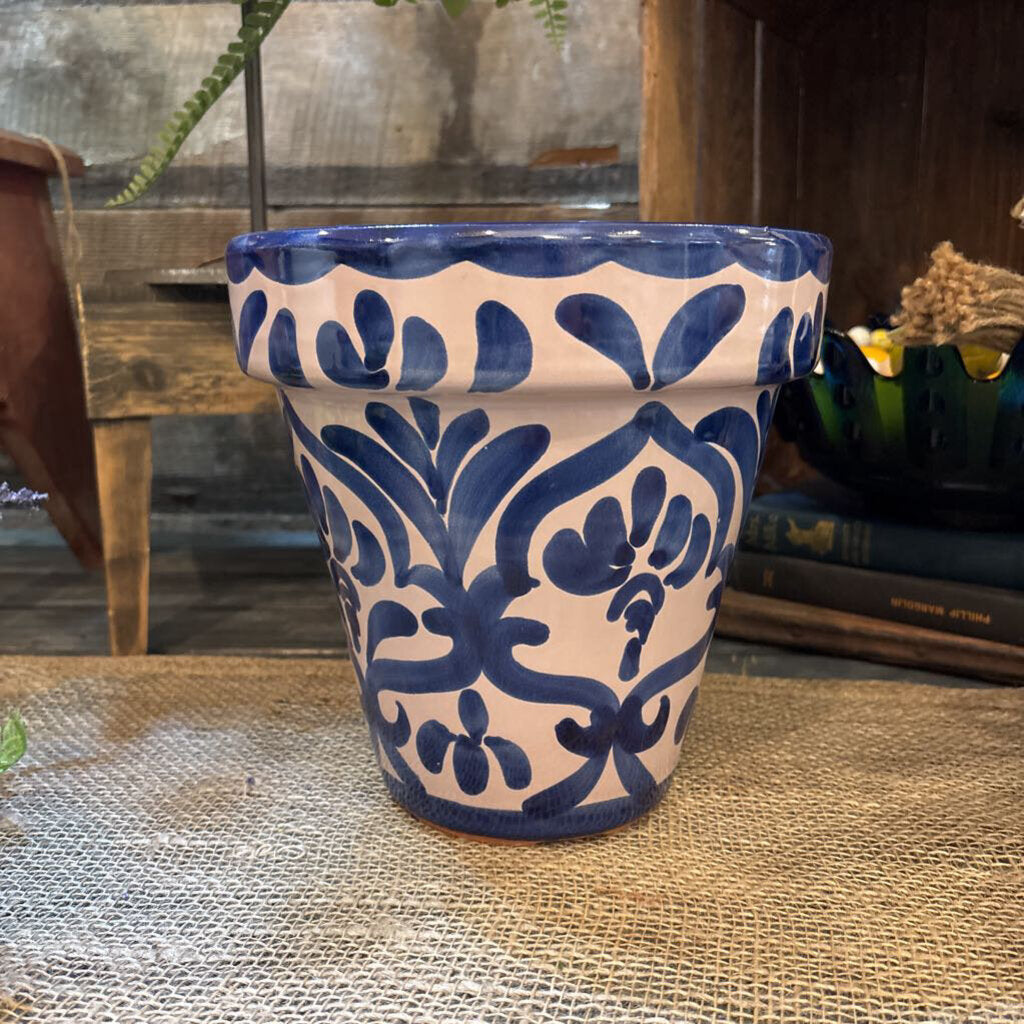 BEAUTIFUL TERRA COTTA PLANTER WITH DRAIN HOLE. MEASURES ALMOST 9" T X 8.5" AT MOUTH