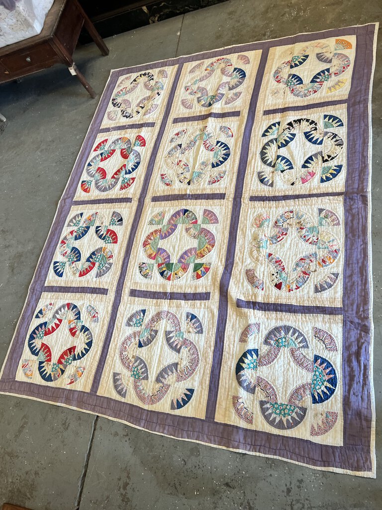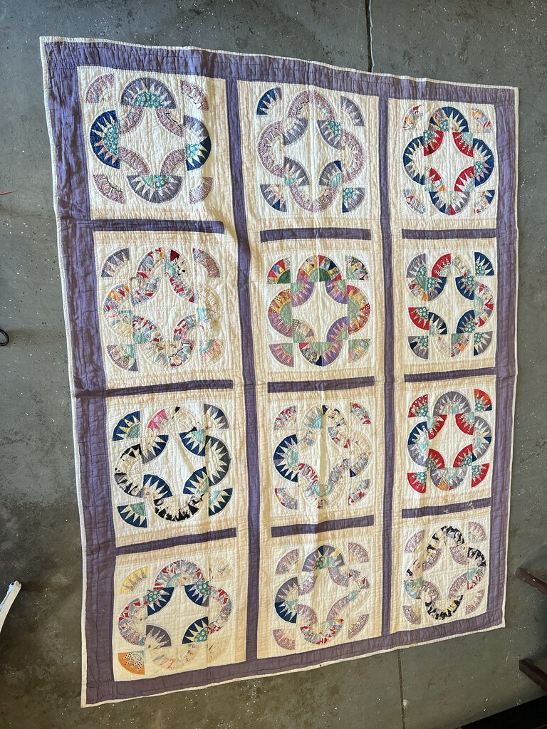 THERE IS NOTHING MORE SWEET THEN A HANDMADE WEDDING RING QUILT! TRIMMED IN PURPLE THIS ONE IS A MUST HAVE! 64" X 81"